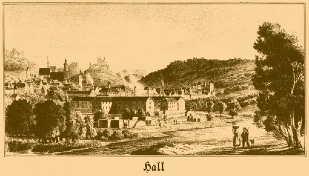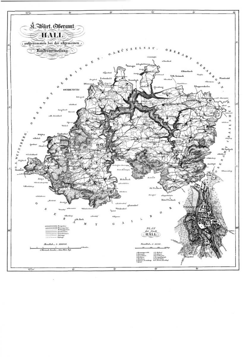 Karte und 4 Tabellen eingebunden. Titelbild: Ansicht Hall. Hauptverfasser: Moser, Hauptmitarbeiter: Bilfinger, Oberamtmann in Hall; Cleß, Pfarrer in Thüngenthal; Bauer, Pfarrer in Gnadenthal; Kurr und andere. -- Beschriebene Orte: